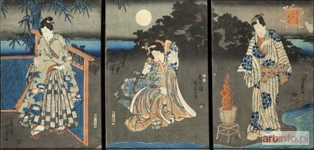 Drzeworyt barwny nishiki-e, format oban tate-e/papier, tryptyk, 36,5 x 71, 5 cm Ishiyama Shugetsu Wydany: ok. 1850 r. Sygnatura: Kōchōrō Kunisada ga香蝶楼国定画 Wydawca: Tsutaya Juzaburo