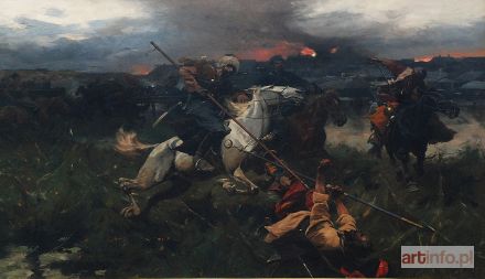 Inne tytuły: Bitwa; Napad tatarski; Podjazd tatarski; Utarczka; Utarczka z Tatarami olej, płótno, 119,5 x 200,5 cm; sygn. l.d.: Józef Brandt / z Warszawy / Monachium na odwrociu nalepki: 1. 4479 / Rew. (rewindykacyjna) 2. Muzeum Narodowe / w Warszawie / nr inw.: 189055 (inwentarzowa) 3. 9426 / 2 / 75 (spisowa)