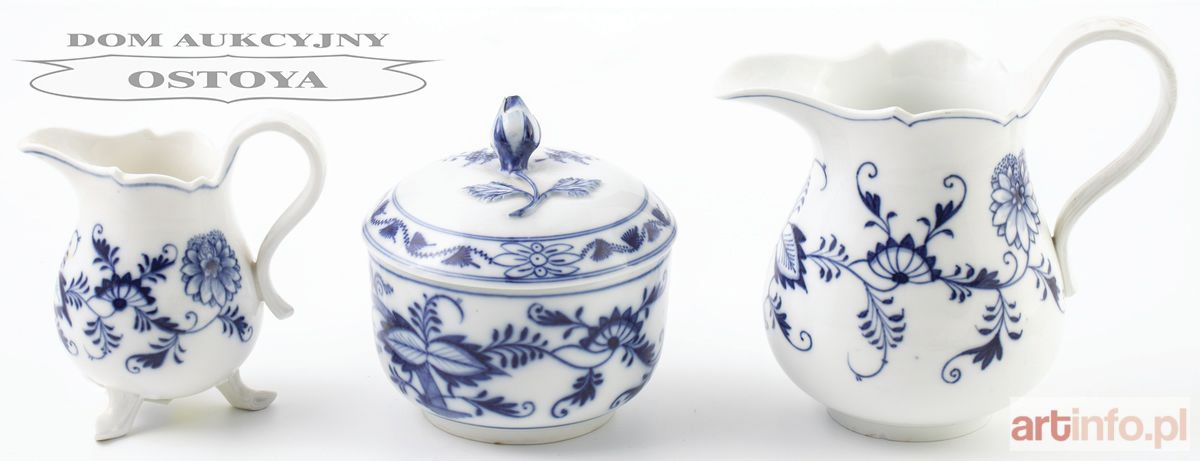 DZBANEK, MLECZNIK I CUKIERNICA z wzorem cebulowym, Saksonia, Miśnia, 2 poł. XIX w.