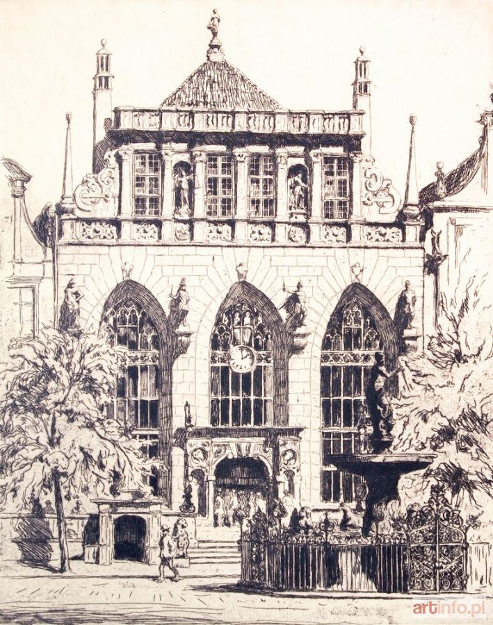 Dwór Artusa, rys. i lit. Berthold Hellingrath, Gdańsk 1925; w dole odręczna sygn. autora; akwf. cz.-b., st. bdb., passe-partout; wymiary płyty: 286x355 mm; bez tyt.;
