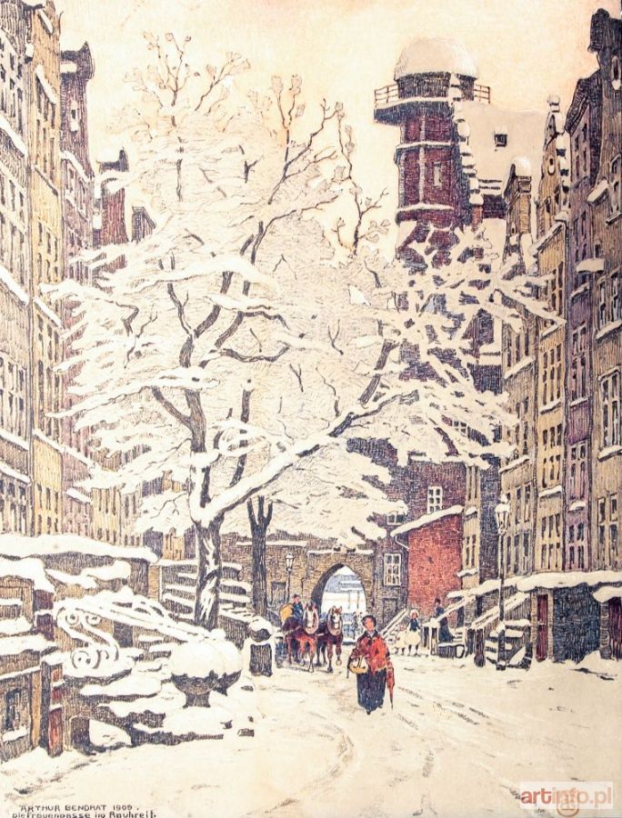 Ulica Mariacka z Bramą Mariacką i wieżą Domu Towarzystwa Przyrodniczego (po przebudowie wieży w 1866 r.) w czasie zimy, rys. znany wedutysta Arthur Bendrat, Kunstanstalt Wilhelm Hoffmann, Drezno, wyd. B.G. Teubner (w dolnym prawym narożniku łączone inicjały BGT), 1905; w lewym dolnym narożniku opis: ARTHUR BENDRAT 1905, / Die Frauengasse im Rauhre i f.; autolitografia kolor., st. bdb.; wymiary widoku: 300x400 mm; Frauengasse in Danzig;