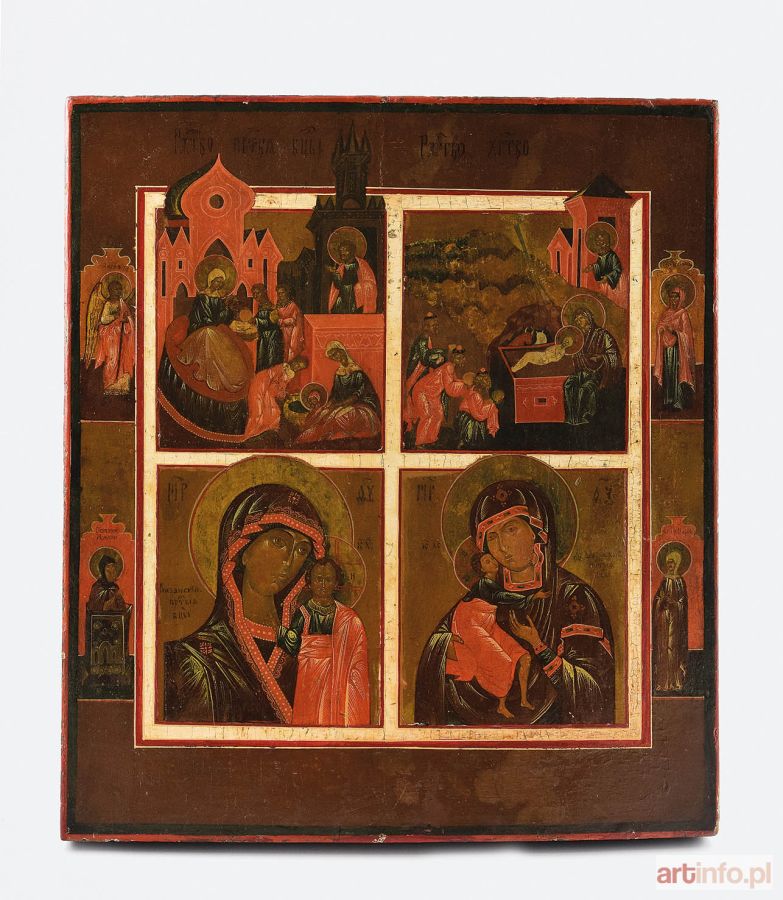 Ikona podzielona na 4 kwatery z białą obwódką: u góry z lewej - Narodziny Marii, z prawej Boże Narodzenie; poniżej z lewej - Hodegetria - Matka Boska Kazańska; z prawej Eleusa - Umilenije - Matka Boska Fiodorowska. Bordiura szeroka, brązowa, z klejmami: z lewej Anioł Stróż i święty mnich Makary Słupnik, z prawej nierozpoznana święta i Maria Egipcjanka. Koloryt całości: brąz, ugier, oliwka, ceglasta czerwień.