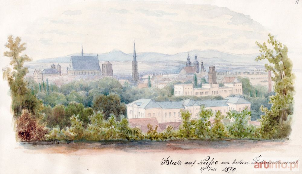 Panorama miasta, w dole odręcznie data: 27 Juli 1879; pochodzą ze szkicownika zawierającego widoki Nysy i innych miast – Scizzen Album von Isenburg, Hauptmann angelegt Mai 1879 in Neiße, autorstwa pruskiego oficera Felixa Alexandra Franza Isenburga, wykonane zostały w latach 1875-1880, techniką akwareli, st. bdb.; wymiary arkuszy: ok. 260x148 mm; tyt. odręcznie w prawym dolnym rogu: Blick auf Neisse vom hohen Retranchement; UNIKAT!
