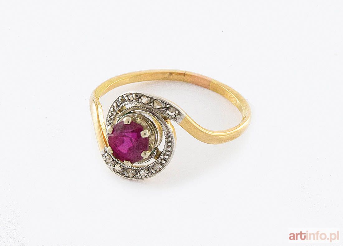 kompozycja z rubinem syntetycznym o masie ok.0.55 ct w otoczeniu 10 szt rautów diamentowych o masie łącznej 0.03 ct, złoto pr.0.750, masa całkowita 3.360 g. Wyrób wykonany we Francji, w okresie międzywojennym XX w.