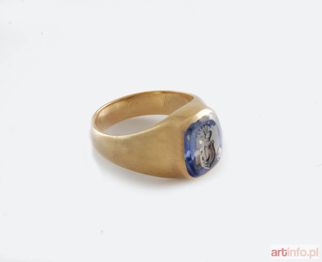 Kamień przeźroczysty, jasnoniebieski, prostokątny, o wyoblonych narożach, z rżniętym herbem Sas, z 5 piórami strusimi w klejnocie. Na złotej szynie po wewnętrznej stronie krakowska cecha probiercza oraz imiennik złotnika „SG”.