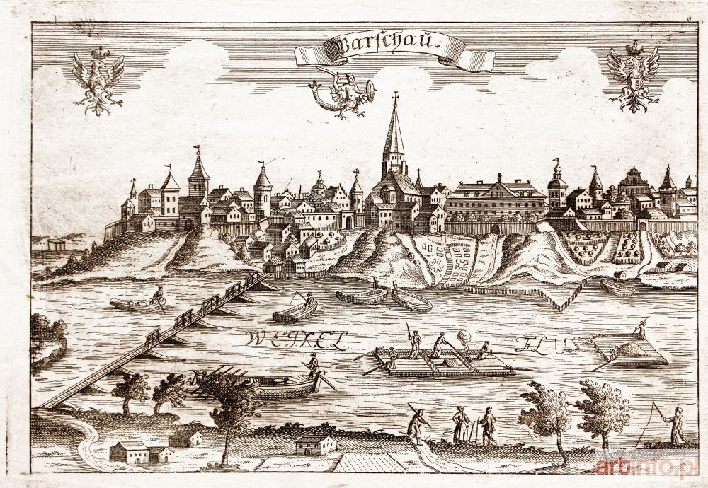 Panorama miasta od str. Wisły, anonim, ok. 1750; na tle nieba 2 polskie orły oraz interesująca postać mitologiczna przypominająca syrenę; miedz. cz.-b. na delikatnym papierze czerpanym, st. bdb., ślady zagięć, passe-partout; wymiary płyty: ok. 265x180 mm; tyt. w górze, na falującej wstędze: Warschau;