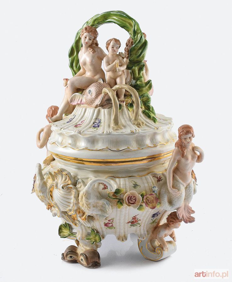 Wybrzuszona, puklowana czasza na 4 wolutowych nóżkach z plastycznym podwójnymi delfinami i puttami, z dwoma plastycznymi kartuszami flankowanymi przez plastyczne łabędzie oraz z uchwytami - syrenami. Na pokrywie modelowanej podobnie, jak brzusiec pełnoplastyczna grupa z nagą nimfą i puttem na delfinie tryskającym z nozdrzy strumieniami wody oraz nimfą siedzącą na ogonie ryby; grupę wieńczy zielony łuk imitujący falę. Dekorację uzupełniają malowane drobne rzuty kwiatków. Neobarokowa waza o przeładowanej dekoracji plastycznej, reliefowej i malarskie inspirowana wzornictwem wazy z miśnieńskiego Serwisu Łabędziego z grupą rzeźbiarską na pokrywie: Galatea z nimfami i puttami na muszlowym rydwanie. Sygnatura jest kombinacją marki miśnieńskiej i oznakowań wytwórni w Rauenstein.