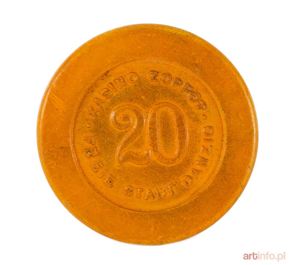Żeton plastikowy, obie strony żetonu o jednakowym rysunku barwy żółto-pomarańczowej. Po środku nominał 20. Dookoła górą w półkolu napis: '·KASINO ZOPPOT· FREIE STADT DANZIG'. Liternictwo proste. śr: 3,6 cm