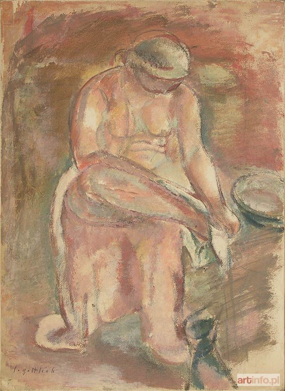 Najmłodszy brat Maurycego Gottlieba, wybitnego malarza dziewiętnastowiecznego pochodzenia żydowskiego. Studia artystyczne odbył w l. 1896-1902 w krakowskiej ASP pod kierunkiem J. Malczewskiego i T. Axentowicza. Naukę kontynuował w Monachium w pracowni A. Ažbego. W 1904 r. zamieszkał na stałe w Paryżu. Był członkiem wiedeńskiego "Haagenbundu" i inicjatorem powstania krakowskiej "Grupy Pięciu" (1905). W l. 1917-1919 uczestniczył w wystawach formistów. W Paryżu związany był ze środowiskiem Montparnasse'u, szczególnie blisko z M. Kislingiem i E. Zakiem. Przedstawioną w oferowanym obrazie symboliczną scenę rozgrywającą się na tle górzystego pejzażu można interpretować jako ilustrację ewangelicznej przypowieści o miłosiernym Samarytaninie, który udziela pomocy napotkanemu na drodze podróżnemu. Jak w wielu obrazach Gottlieba - często wyobrażających biblijne motywy - najważniejsze wydaje się ograniczenie gamy barwnej do tonów rudawych brązów i zieleni oraz linearny rytm kompozycji, który budują łukowate odcinki linii powtarzające się zarówno w ludzkich postaciach jak i w pejzażu. Rytm ten sprawia, że obraz zyskuje cechy muzyczne, i że opowiedziane w Ewangelii zdarzenie przeobraża się w dziele Gottlieba w rytualny obrzęd stanowiąc jednocześnie żywą alegorią chrześcijańskiej cnoty Caritas. Przestylizowane postacie o uwysmuklonych proporcjach i umownie zaznaczonych rysach wpisane w ekspresyjnie spłaszczoną przestrzeń obrazową zyskują walor dekoratywności. Analogiczne cechy stylistyczne wykazuje należący do kolekcji W. Fibaka obraz "Chrystus w łodzi" z 1919 r. (repr. w katalogu "Malarstwo polskie w kolekcji Ewy i Wojciecha Fibaków, Muzeum Narodowe w Warszawie 1992, s. 82; "Ecole de Paris. Artyści żydowscy z Polski w kolekcji Wojciecha Fibaka, Muzeum Historii Miasta Łodzi 1998-1999, s. 44)