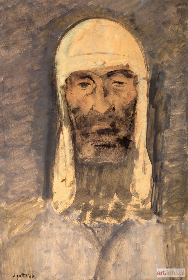 Najmłodszy brat Maurycego Gottlieba, wybitnego malarza dziewiętnastowiecznego pochodzenia żydowskiego. Studia artystyczne odbył w l. 1896-1902 w krakowskiej ASP pod kierunkiem J. Malczewskiego i T. Axentowicza. Naukę kontynuował w Monachium w pracowni A. Ažbego. W 1904 r. zamieszkał na stałe w Paryżu. Był członkiem wiedeńskiego "Haagenbundu" i inicjatorem powstania krakowskiej "Grupy Pięciu" (1905). W l. 1917-1919 uczestniczył w wystawach formistów. W Paryżu związany był ze środowiskiem Montparnasse'u, szczególnie blisko z M. Kislingiem i E. Zakiem. Przedstawioną w oferowanym obrazie symboliczną scenę rozgrywającą się na tle górzystego pejzażu można interpretować jako ilustrację ewangelicznej przypowieści o miłosiernym Samarytaninie, który udziela pomocy napotkanemu na drodze podróżnemu. Jak w wielu obrazach Gottlieba - często wyobrażających biblijne motywy - najważniejsze wydaje się ograniczenie gamy barwnej do tonów rudawych brązów i zieleni oraz linearny rytm kompozycji, który budują łukowate odcinki linii powtarzające się zarówno w ludzkich postaciach jak i w pejzażu. Rytm ten sprawia, że obraz zyskuje cechy muzyczne, i że opowiedziane w Ewangelii zdarzenie przeobraża się w dziele Gottlieba w rytualny obrzęd stanowiąc jednocześnie żywą alegorią chrześcijańskiej cnoty Caritas. Przestylizowane postacie o uwysmuklonych proporcjach i umownie zaznaczonych rysach wpisane w ekspresyjnie spłaszczoną przestrzeń obrazową zyskują walor dekoratywności. Analogiczne cechy stylistyczne wykazuje należący do kolekcji W. Fibaka obraz "Chrystus w łodzi" z 1919 r. (repr. w katalogu "Malarstwo polskie w kolekcji Ewy i Wojciecha Fibaków, Muzeum Narodowe w Warszawie 1992, s. 82; "Ecole de Paris. Artyści żydowscy z Polski w kolekcji Wojciecha Fibaka, Muzeum Historii Miasta Łodzi 1998-1999, s. 44)