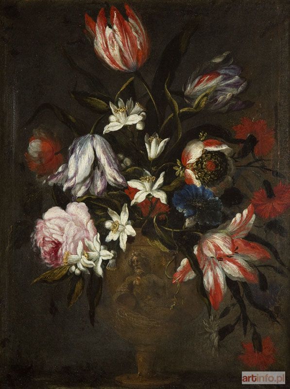 Obrazy przedstawiające bukiety kwiatów, zastawione owocami stoły, czy trofea myśliwskie nie tylko pozwalały artystom XVII-ego wieku na popis zdolności do wiernego oddawania natury, ale także na budowanie skomplikowanych programów alegorycznych. Na płótnach Holendrów i Flamandów kwiaty nie są "po prostu" kwiatami, ale kodują trudne dziś do odczytania symboliczne sensy. Jednym z mistrzów umiejętnie łączących maestrię wykonania obrazu z zachowaniem jego alegorycznej treści był tworzący w pierwszej połowie XVII stulecia Jan Brueghel Starszy (zwany ze względu na subtelny charakter faktury jego obrazów: Aksamitnym). Prezentowana martwa natura, choć zapewne nieco późniejsza niż prace mistrza z Antwerpii, pozostaje pod wpływem jego sztuki. Trudno stwierdzić, gdzie obraz powstał. Wysoka jakość artystyczna sugeruje związek z jednym z ważniejszych ośrodków Północy. Przedstawione kwiaty (róże, czerwone goździki, białe narcyzy i modne w siedemnastym wieku tulipany) są reprezentatywne dla kilku ośrodków artystycznych Północnej Europy. Podobnie malowana en grisaille waza z Wodnikiem występuje w XVII i XVIII wieku w kompozycjach pochodzących zarówno z Holandii i Niemiec, ale też Francji. Dobór motywów i sposób ich potraktowania poświadcza jednak, że w przypadku prezentowanego obrazu mamy do czynienia z malarzem na bieżąco śledzącym trendy współczesnej mu sztuki.