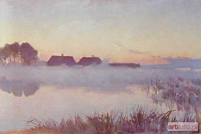 Olej, płótno naklejone na tekturę, 33,4 x 48,8 cm Sygnowany czarnym olejem p.d.: T. ZIOMEK Na odwrocie nalepka: "19449 Autor Ziomek Teodor | Tytuł Mgły Rodzaj dzieła ol. | Cena ... Własność ... Data nadesłania ... 192 ..."