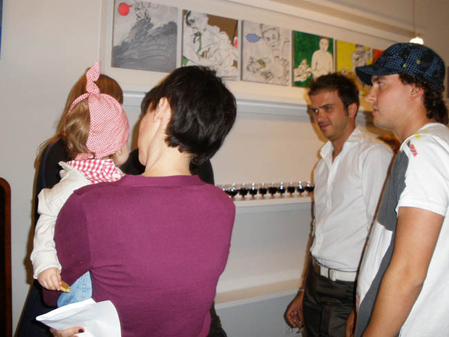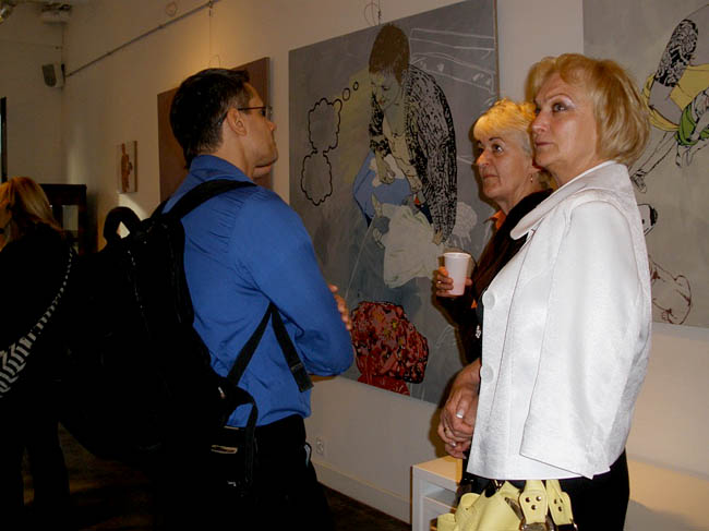 Dla nich wystawa Sandomierz musi być szczególnie bliska. Na obrazach widzimy artystkę w zaawansowanej ciąży w fotelu, na innym siedzi na łóżku obok leżącego niemowlaka, albo podnosi go w górę śmiejąc się, są razem na plaży – to ujęcia zwyczajne, codzienne, żadnego pozowania do pamiątkowych fotografii. Do tego maluje realistycznie, w tym sensie, że grafika tych prac , linia jest wiernym odbiciem rzeczywistych rysów twarzy, rodzaju ubioru itd. Nierealne jest tylko użycie koloru – komiksowy rysunek pokryty farbą, podkolorowany. Jest w tych pracach dużo szczerości, chęci podzielenia się swoim życiem.