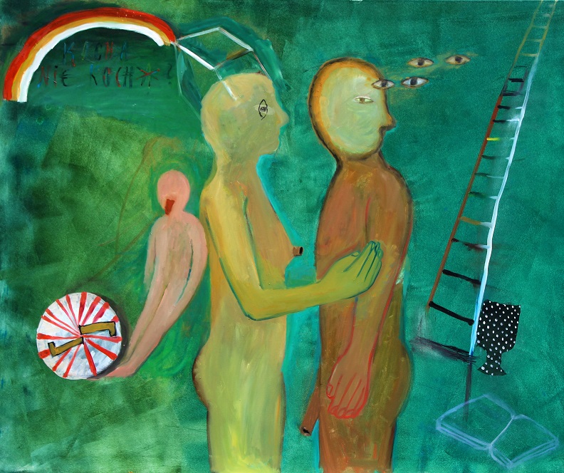 Coś woła, może głośniej, może ciszej, ale przecież zahacza naszą uwagę w prostym komunikacie „popatrz na mnie” wyrażanym dyskretnie, nienachalnie, cierpliwie albo zaczepnie, prowokacyjnie, wyraziście. Takie są prace zgromadzone na wystawie Szepty i Hałasy. Ten lekko sparafrazowany tytuł, wywodzący się od słynnego filmu Ingmara Bergmana, wyznacza zakres temperatury emocji zawartych w ponad trzydziestu dziełach artystów zaproszonych do tej prezentacji przez Profesora Józefa Hałasa. Piętnastu twórców - przedstawicieli różnych pokoleń, związanych w mniejszym lub większym stopniu z różnymi nurtami, pracujących w różnych technikach, operujących odmiennymi stylistykami, uprawiających i sztukę przedstawiającą, i abstrakcję, obserwujących świat po swojemu, a przede wszystkim po swojemu ten świat interpretujących. Tytułowa skala pomieściła wszystkie sposoby wypowiedzi, z których najwięcej sytuuje się gdzieś pomiędzy skrajnymi postaciami dźwięku, wychodząc od ciszy (Andrzej Ziomek), a na manifeście kończąc (Elżbieta Terlikowska). Taką specyficzną klamrą są dla kuratorki wystawy także dwie prezentowane na wystawie prace sprawcy tej artystycznej konfrontacji, Józefa Hałasa. Ascetyczny w swej zawartości akryl Drugi duży z cyklu Piony, skosy (w którym dwie czerwone diagonale, wyraziście „brzmiąc” barwnie, tym bardziej podkreślają błękitną próżnię wypełniającą obraz) zaprasza do refleksji, a nawet do medytacji wymagającej od odbiorcy całkowitego wyciszenia. Natomiast Duże figury rozpychają ramy przedstawienia, konkurują o uwagę widza, jakby zagłuszając nawzajem snute przez siebie opowieści. Podobnie rzecz ma się w przypadku wybieranych przez twórców stylistyk. W cichych rejestrach odnajduję surrealistyczne, melancholijne pejzaże Ziomka (Gennesaret, Głos delikatnej ciszy), transcendentalny symbolizm Michaliny Cieślikowskiej-Kulmatyckiej (Myśli, Z rybą), ale i poezję konkretu zwyczajności u Piotra Tyszkowskiego (Dwie szpulki), czy poszukiwanie prawd uniwersalnych i doskonałości w świecie sztuki obecne w abstrakcyjnych kompozycjach Janusza Merkla (z cyklu Podziały prawie złote). Natężenie „bezgłośnego wydźwięku” malarstwa rośnie, w kolejnej grupie prac zachowując jednak równowagę w użytych środkach. A zatem idealnie zbalansowana geometryczna abstrakcja Aleksandra Dymitrowicza (Pejzaż znaleziony w pamięci), na pozór tylko wyciszone pejzaże Martyny Merkel (z cyklu Reminiscencje) i dekoracyjne ceramiczne Okruchy pamięci Pauliny Ziemby. Marian Waldemar Kuczma zaproponował trzy różne natężenia: od relatywnie stonowanej Szarej blachy po plątaninę wątków formalnych i treściowych w Arezzo. W zdecydowanie „głośniejszej” strefie znaleźli się: Marian Wołczuk ze swoimi zrytmizowanymi, także o zmiennej temperaturze, kompozycjami z cyklu Rekonstrukcje; Kasia Banaś i jej nieokiełznane barwne pejzaże (Daleko stąd na południe, Czarny statek), Jola Nikt ze swoimi neoprymitywistycznymi bajkami dla dorosłych (Kocha nie kocha, Mała żona wielkiego męża), Zdzisław Nitka w konsekwentnie neoekspresjonistycznych pracach malarskich (Ojciec i syn, Otto Müller), wreszcie Kasia Kmita z neo-popartowskimi wycinankami i foliowymi kolażami zanurzonymi w świecie zniewolonym nieustającą konsumpcją i dyktatem mody (Wybór, Zbiór biały, Zbiór czarny), oraz Elżbieta Terlikowska z fotograficznymi kompozycjami kolażowymi portretującymi utraconą niewinność spod znaku Mickey Mouse Is Dead.