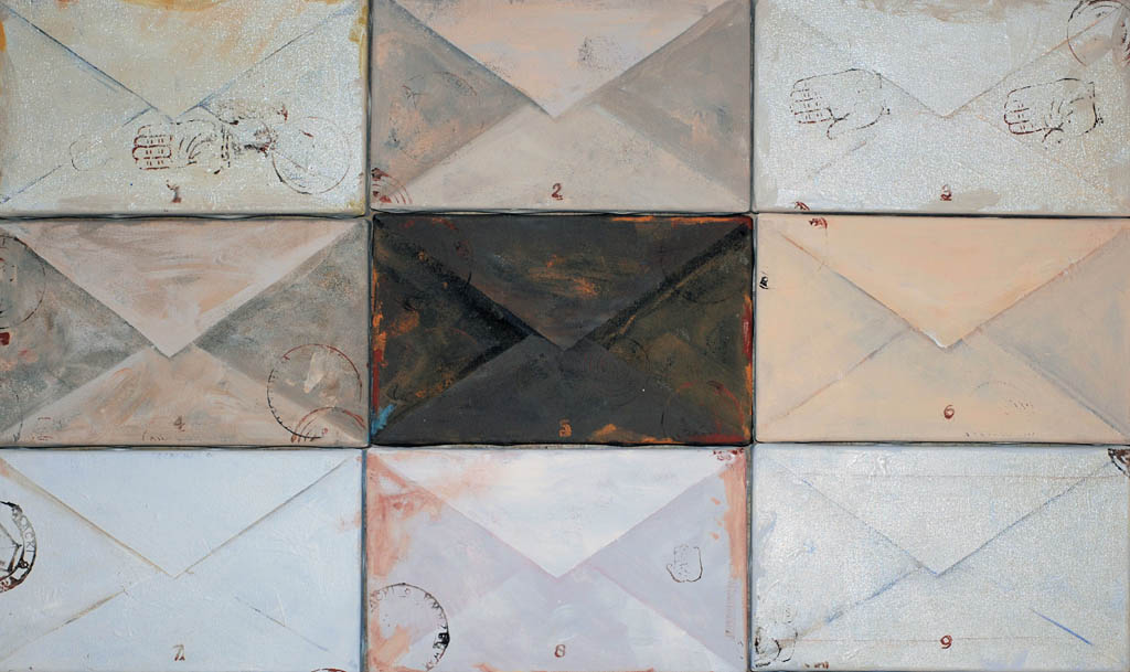 Pierwszy, którego prace zainaugurowały cykl jest Dariusz Mlącki. Spoglądając z daleka na to, co stworzył, nie do końca jesteśmy pewni techniki – rzeźba, relief, czy malarstwo? Zwielokrotnione formy kopert ułożone w większe prostokąty łudząco wydają się być trójwymiarowe. Ich powierzchnia jakby zniszczona, lekko pomięta i pobrudzona – potęguje to wrażenie. Pojedyncza koperta, o dużym formacie, zdobi ścianę. Ale czy mamy do czynienia z prawdziwą, szarą, częściowo poklejoną, już nieco starą kopertą? Czy to kolejne złudzenie? Czy tak jak niełatwo znaleźć tu granicę między jawą a rzeczywistością, tak ciężko dopatrzyć się jej w tzw. realu? Czy życie, którym żyjemy istnieje naprawdę, czy tylko w naszej wyobraźni? Czy świat, który uznajemy za nasz jest tylko światem w naszej głowie, czy światem obiektywnym? Co jest naprawdę, gdzie przebiega linia oddzielające prawdziwe od nieprawdziwego?