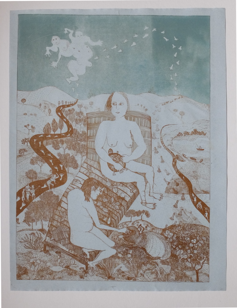 Równolegle do wystawy trwającej w krakowskim Muzeum Narodowym możemy delektować się wystawą prac na papierze Ewy Kuryluk i towarzysząca jej książką, stanowiąca katalog i zarazem opracowanie twórczości artystki z lat 1959-1975. Graficzny dorobek imponuje biegłością warsztatową, wielką swobodą wydobywania wszystkich niuansów litografii, wzbogacanej kolażem, dodanym kolorem, dobranym barwnym tłem. Rysunek białym tuszem na czarnym papierze misternie opracowuje delikatne szczegóły bujnej narracji.