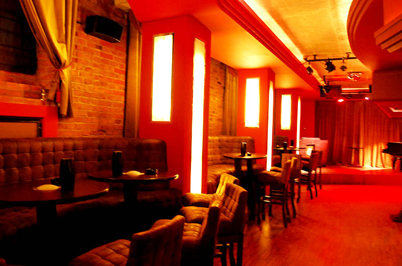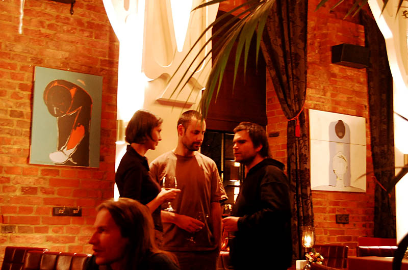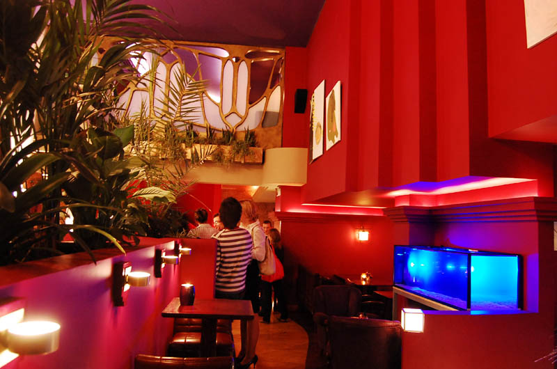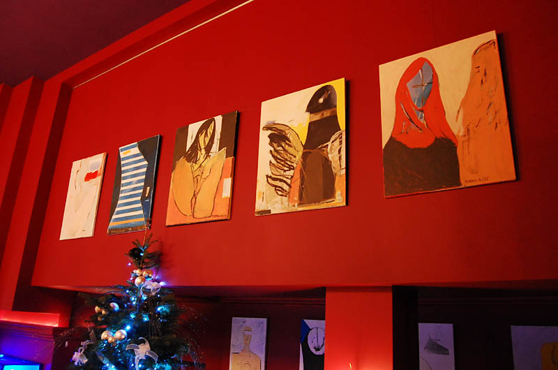 Klimat wnętrza lokalu nie nawiązuje do praskiego otoczenia, a przeciwnie - tworzy ekskluzywną oprawę, podkreśloną bogatą aranżacją, stawiającą na dekoracyjność i wygodę. Mimo takiego pomysłu na przestrzeń znalazło się tu odpowiednie miejsce na sztukę. Ogromna, pusta, pomalowana "muzealną" czerwienią ściana nad barem stanowi bardzo dobre passe-partout dla współczesnego malarstwa. To ona czyni 80 % przygotowanej wystawy, korespondując z niewielką ilością prac umieszczonych między filarami po przeciwnej stronie lokalu.