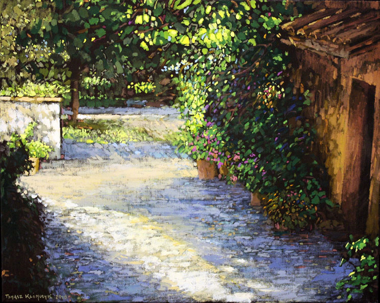 Niezwykła kolorystyka charakteryzuje również prace Tomasza Klimczyka, które wypełniają drugą część wystawy. Artysta ukończył ASP w Krakowie, gdzie studiował malarstwo w pracowni profesora Zbysława Maciejewskiego (1994). Obrazy Tomasza Klimczyka – wielokrotnie wyróżniane i nagradzane - były prezentowane podczas indywidualnych wystaw krajowych i zagranicznych, a także wystaw zbiorowych (m.in. w Anglii, Francji, Holandii, Japonii, Niemczech, Czechach). Płótna wystawione w Galerii SD tworzą swego rodzaju opowieść o odwiedzanych przez Artystę miejscach nasyconych barwami i światłem. Wśród malowanych pejzaży zachwycają słoneczne zaułki włoskich, chorwackich i greckich miasteczek (m.in. Motyw z Krety, Grożnijan, Istria, Palermo. Sycylia), ukwiecone ogrody (np. Słoneczna weranda, W moim ogrodzie, W ogrodzie) i zdobione donicami ulice. Zestawione prace Haliny Nowickiej i Tomasza Klimczyka nie tylko współbrzmią, ale czynią ekspresję barw, nastrojów, wrażliwości i interpretacji artystycznych jeszcze bardziej wyrazistą. Wystawę w Galerii SD można oglądać do 31 sierpnia.