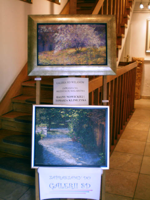 W pierwszej części zachwycają ciepłe, wysublimowane i jakby nieco zamglone płótna Haliny Nowickiej. Artystka ukończyła ASP w Łodzi, gdzie studiowała malarstwo w pracowni profesora Wiesława Garbolińskiego i projektowanie ubioru w pracowni profesora Jana Finkszteina (1985). Halina Nowicka jest laureatką ogólnopolskich konkursów malarskich, prezentowała także prace podczas licznych wystaw indywidualnych i zbiorowych w kraju oraz za granicą m.in. w Niemczech, USA, Francji, Holandii, Czechach. W Galerii SD Wilanów można obejrzeć jej utrzymane w konwencji impresjonistycznej nostalgiczne pejzaże (np. Makowe pole, Impresja, Mleczna droga), urzekające subtelną barwą płótna Niepewność, Love czy Szepty, a także pełne kolorów i migotliwych odcieni impresje m.in. Rajski ogród czy Red Horizon.