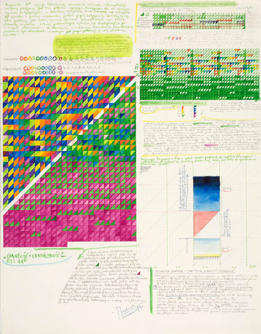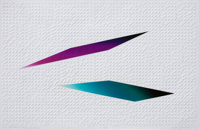 Misternie przygotowane matryce do suchego tłoku, matematycznie wyliczony rytm geometrycznych form tła zderzony z oszczędnym barwnym elementem daje niesłychanie mocną w sile wyrazu, absolutnie przekonywującą kompozycję.