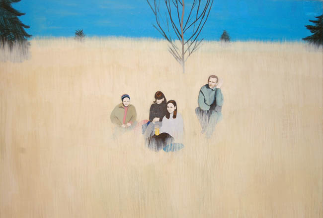 Na wystawie, Magdalena Karpińska, prezentuje obraz Mrówkojad w górach. Jest to niepokojący obraz, ale z drugiej strony wywołuje uśmiech. Mamy góry, turystów odwróconych plecami do głównego planu, którzy oddają się kąpieli słonecznej, i jakby nigdy nic, lawirującego między leżakami mrówkojada. Zwierzę jak z kreskówki, które nie wzbudza żadnego zainteresowania turystów. Kolejnym ciekawym elementem obrazu jest statek płynący w chmurach. Efekt, jakby źle zamalowanego tła, kryjącego obraz w obrazie. Odczytuje się pewną groteskę w tym działaniu, zabawę, ale też uczucie niepokoju. Mimo radosnej kolorystyki i skąpanych w słońcu gór, pojawia się mrówkojad, którego nie powinno tam być. Podobne odczucie wzbudza obraz 97. Niebieskie niebo, łąka, drzewa i cztery osoby na pikniku. Jednak znowu coś nie gra, postaci są lekko uśmiechnięte, ale smutne i siedzą przy jednym suchym drzewie bez liści. Ta dwu biegunowość da się odczytać na wielu obrazach artystki.