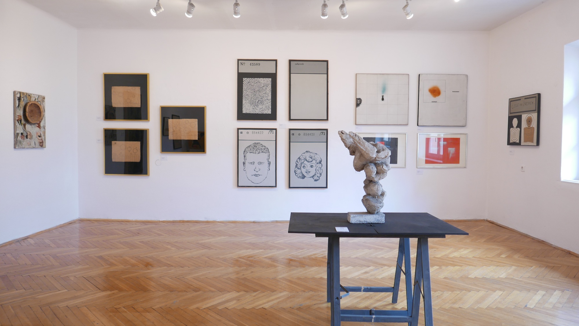 Na ścianie pod oknem pokaz uzupełnia obraz Tabela trafień z przełomowego dla Polski roku 1970.